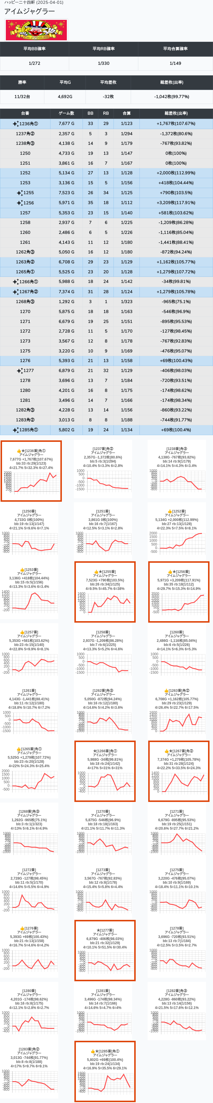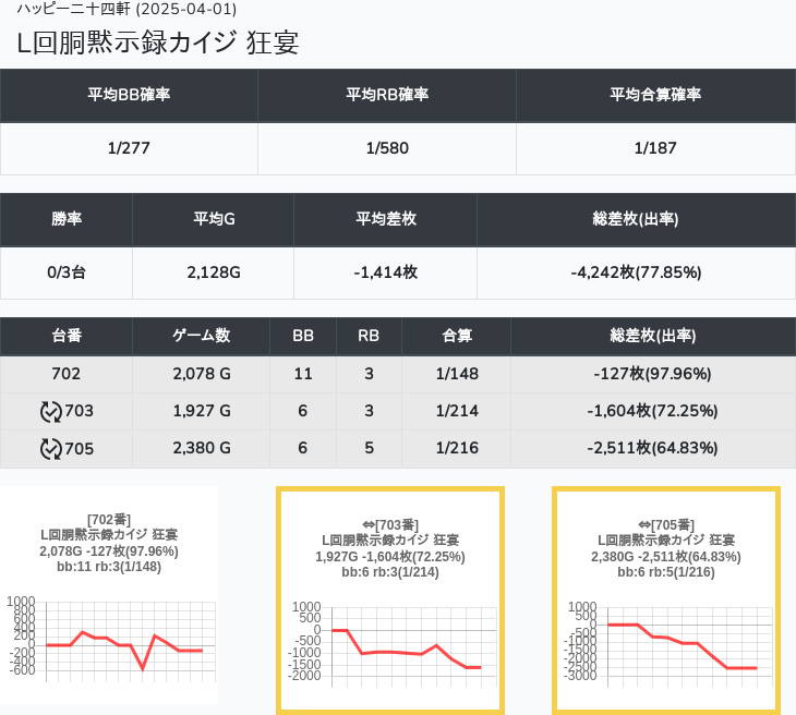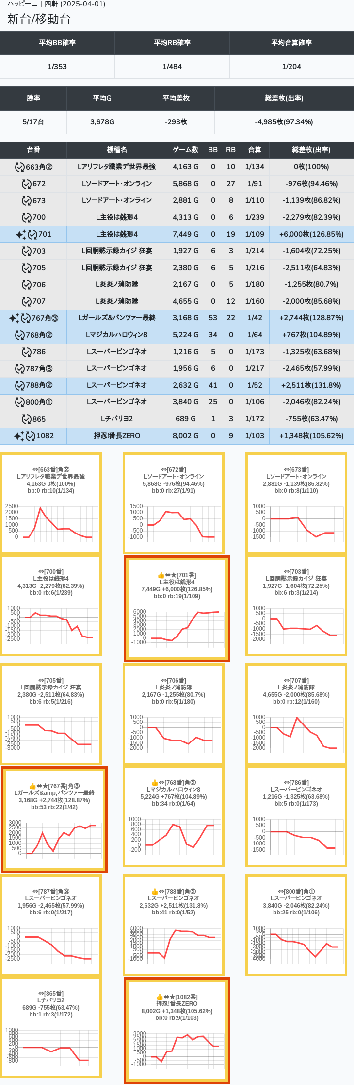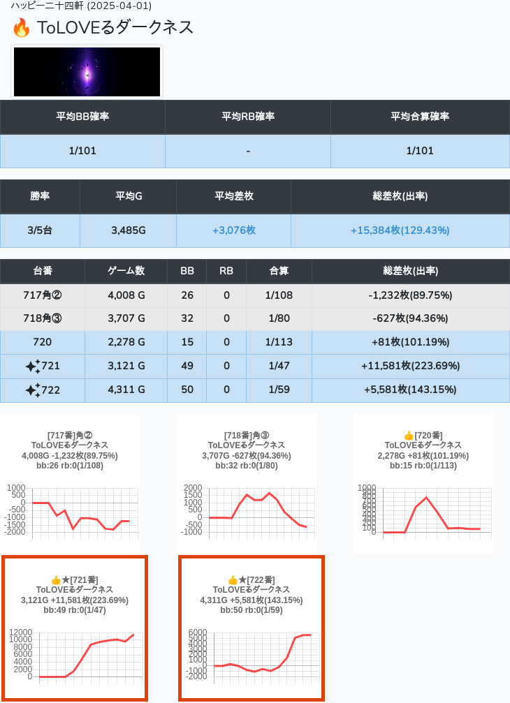 4月1日 ハッピー二十四軒 -14,366枚 甲鉄城のカバネリ 9/11台 ハナビ 3/5台 Lモンスターハンターライズ 3/5台