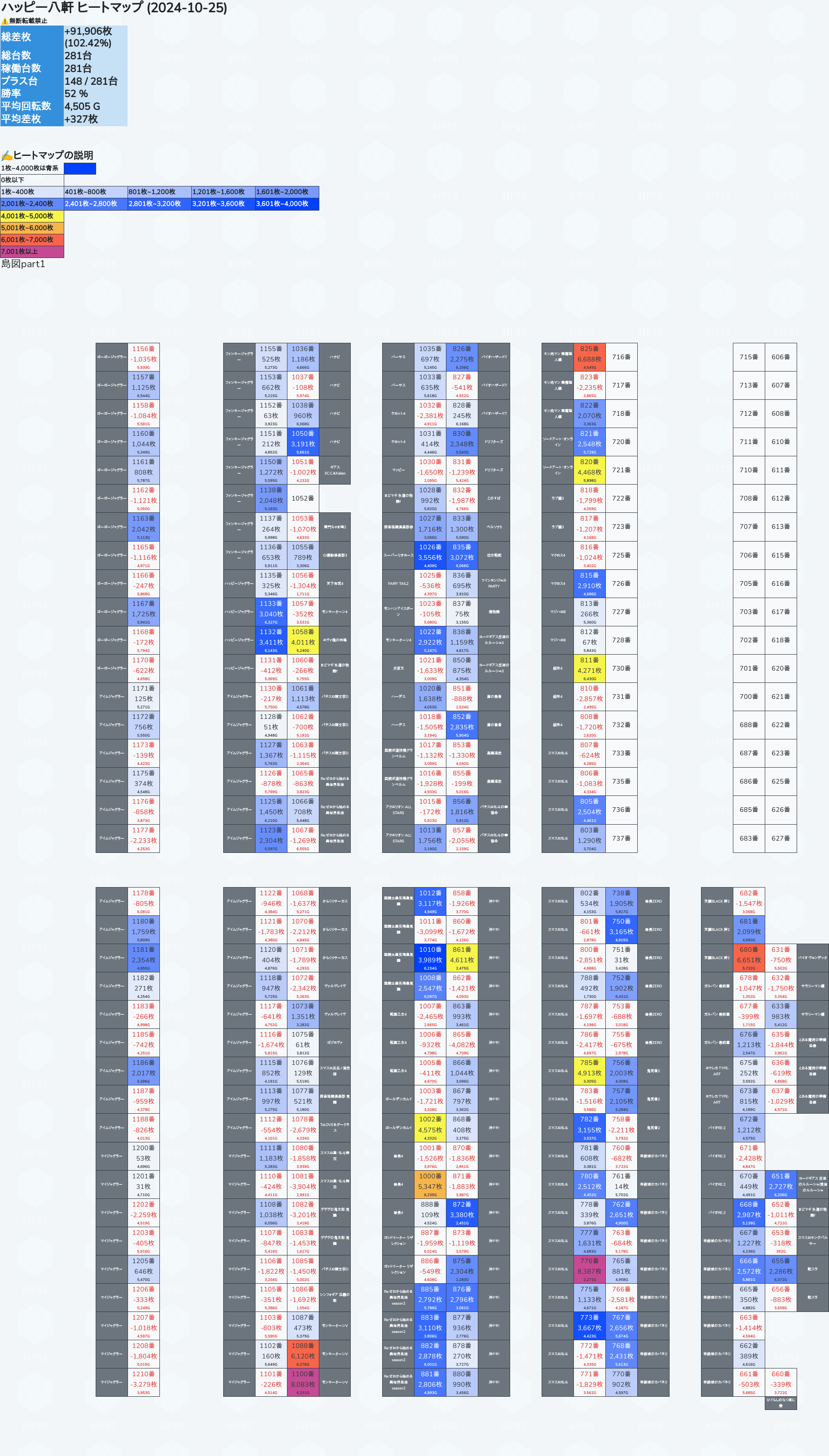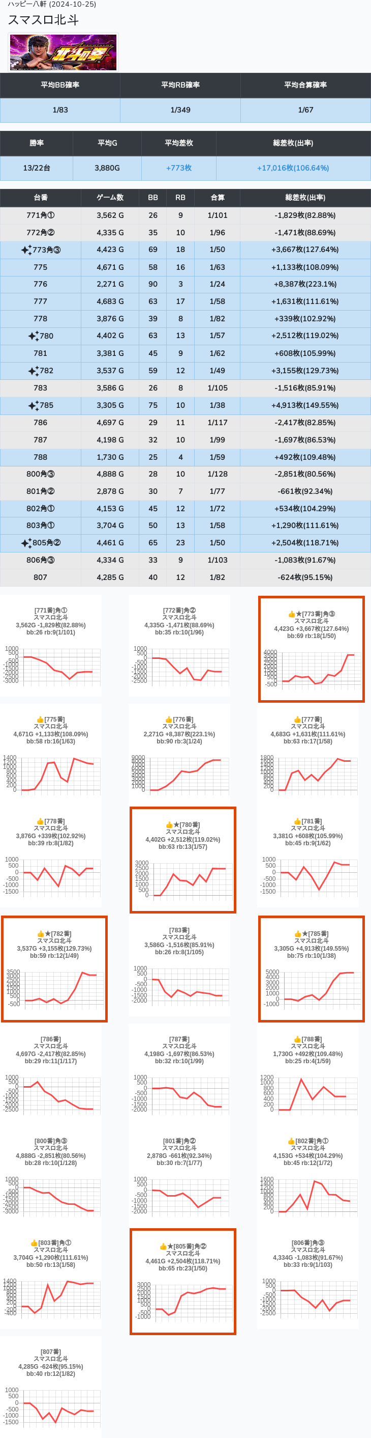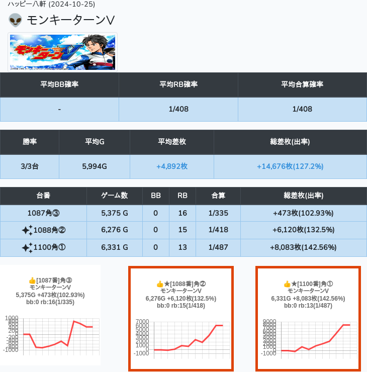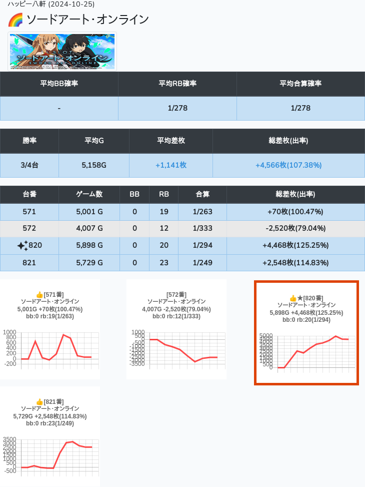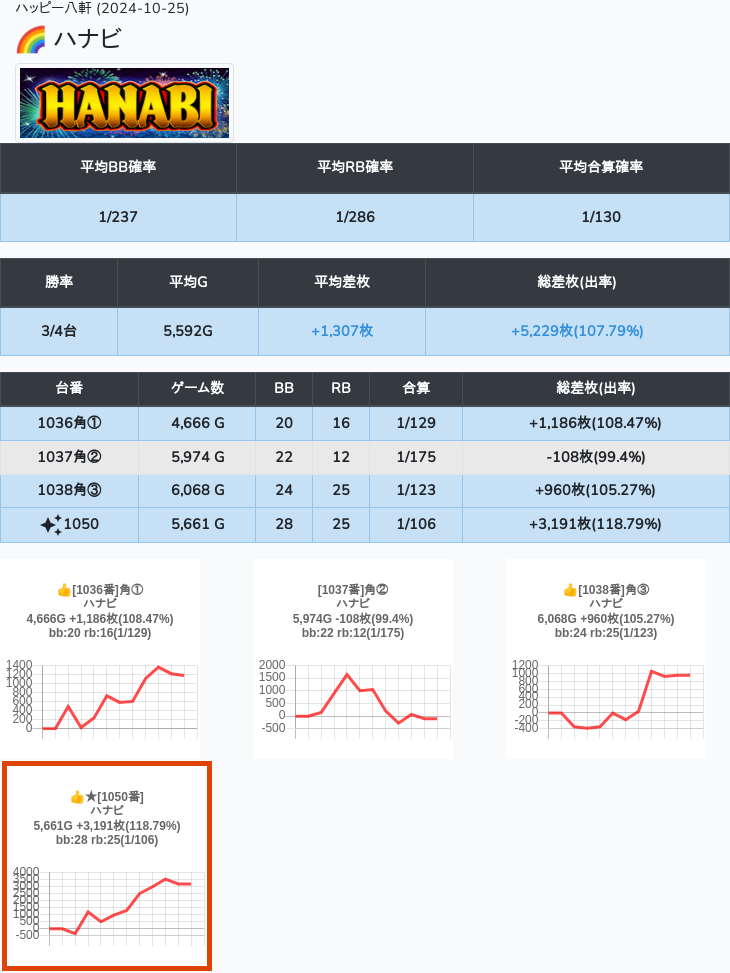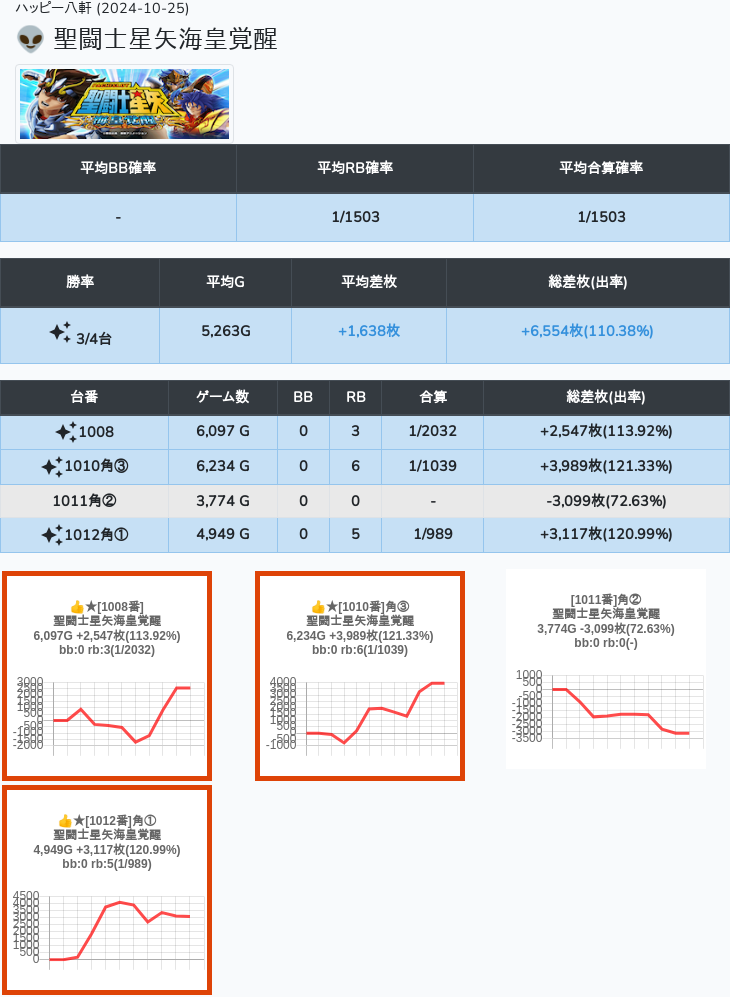 【オンサロ要望】 10月25日 ハッピー八軒 +91,906枚 聖闘士星矢海皇覚醒 3/4台 ハナビ 3/4台 モンキーターンV 3/3台