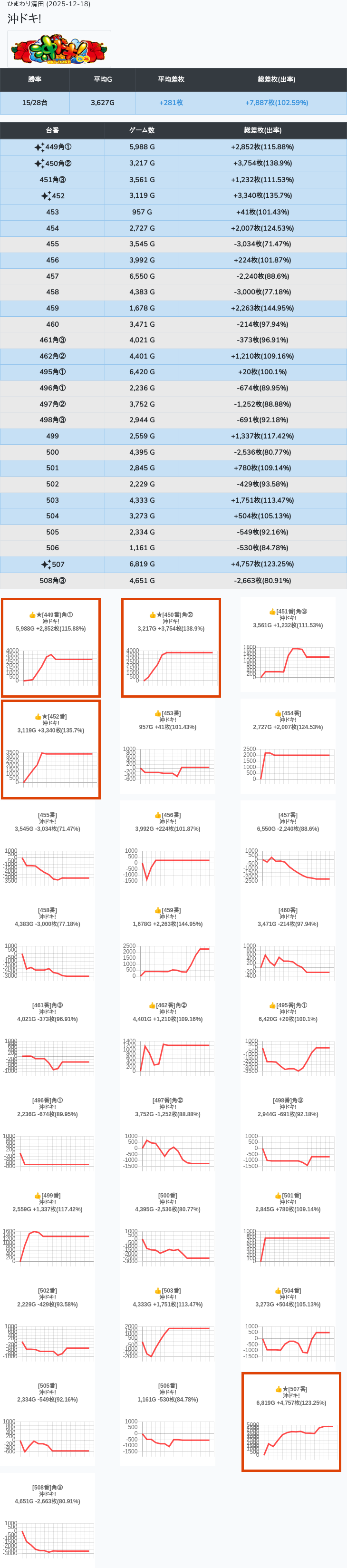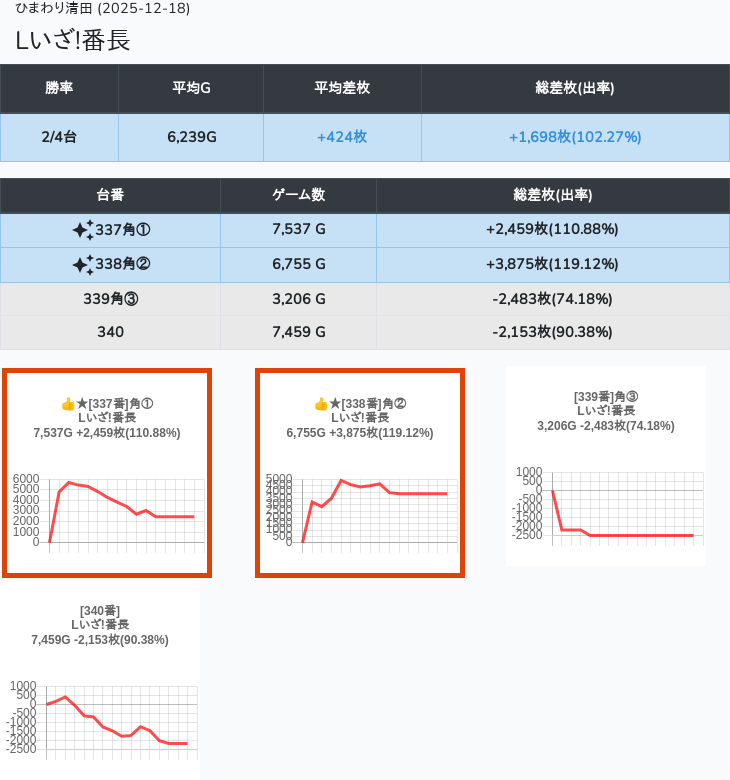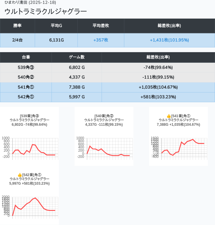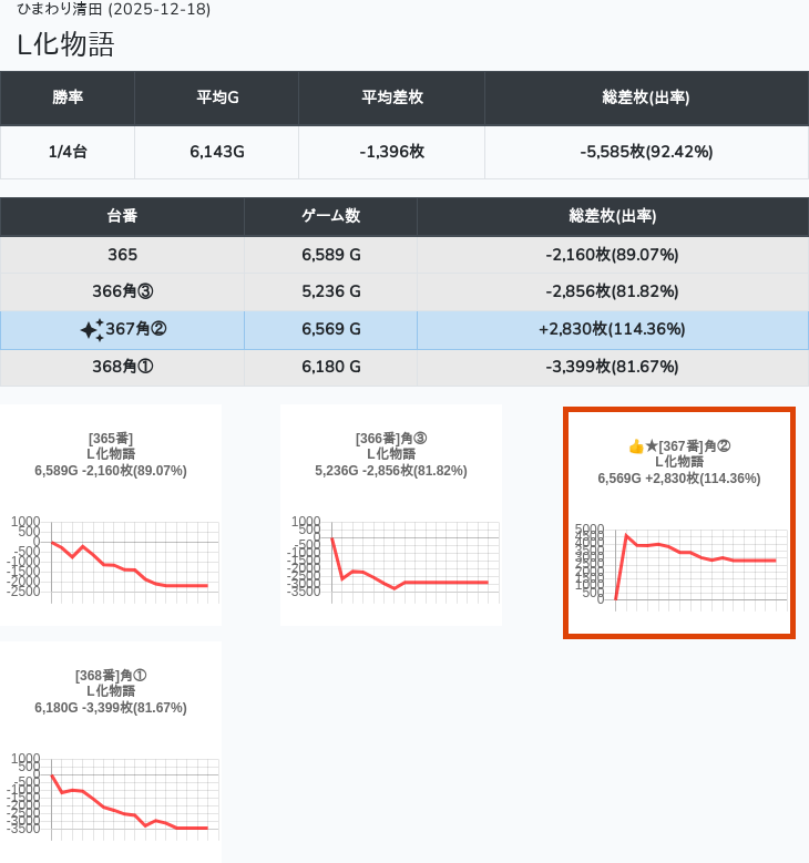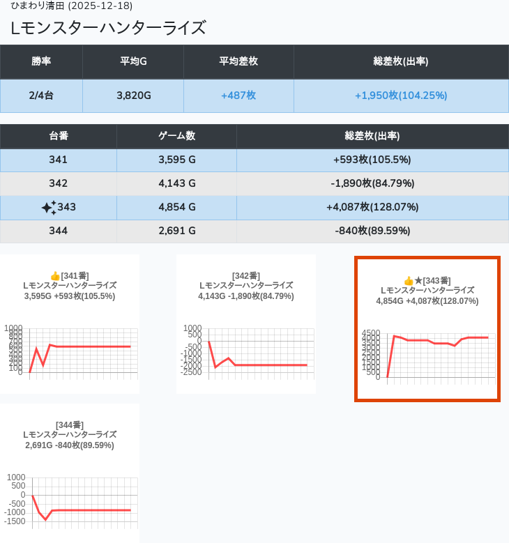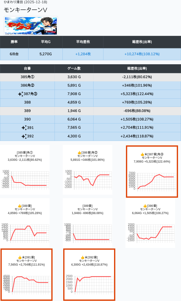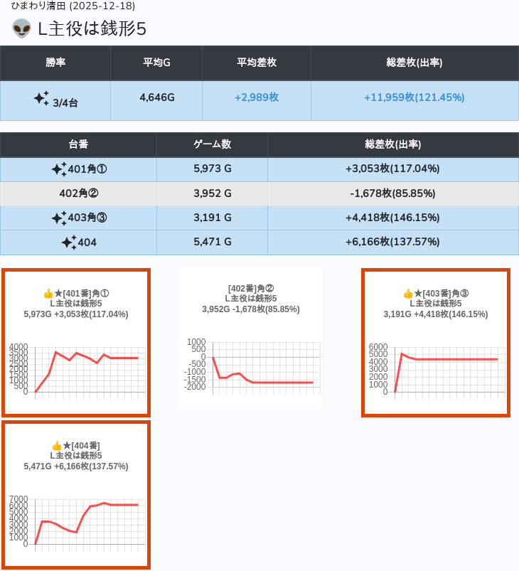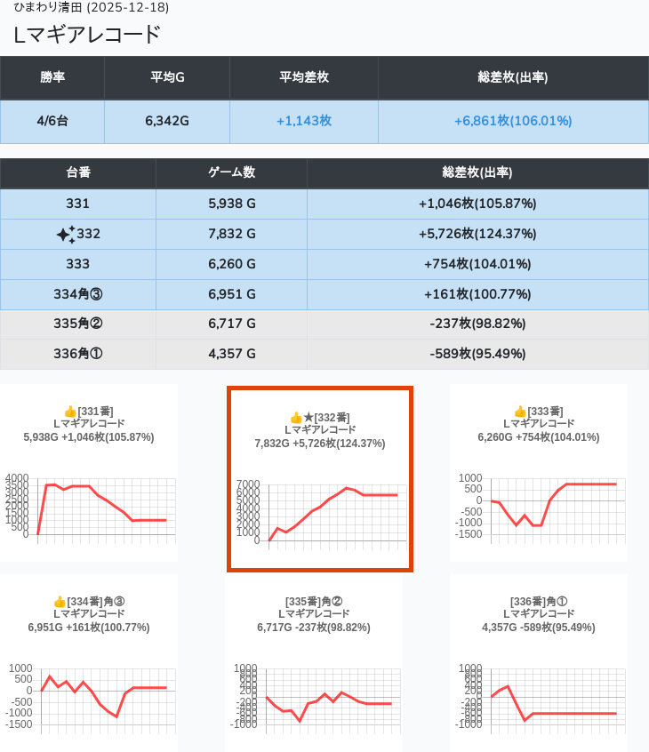 12月18日 ひまわり清田 +122,550枚 Lマギアレコード 4/6台 モンキーターンV 6/8台 L主役は銭形5 3/4台