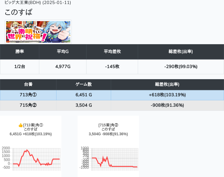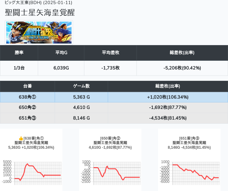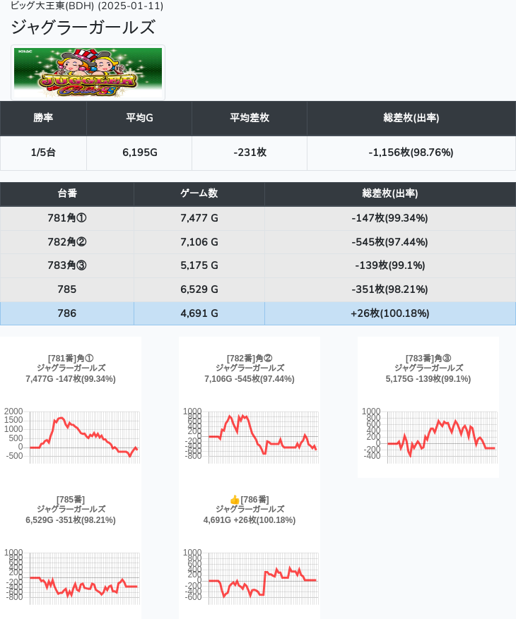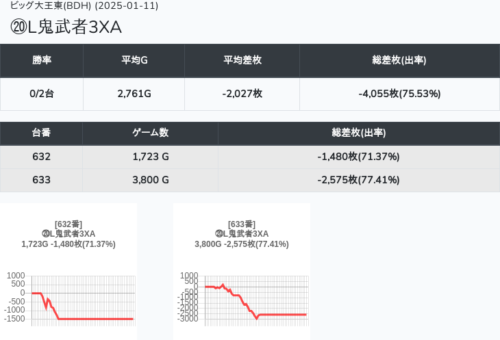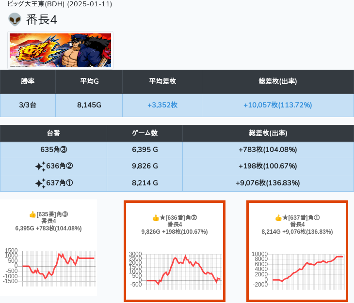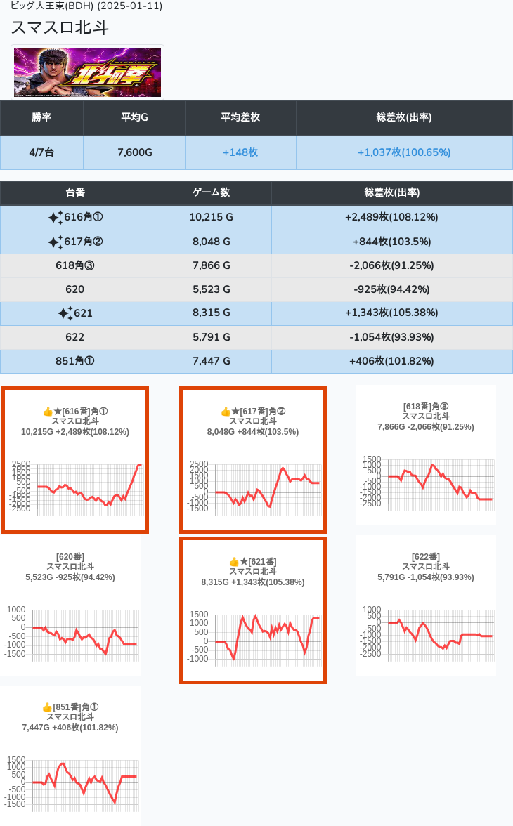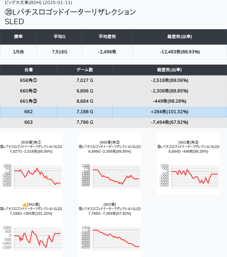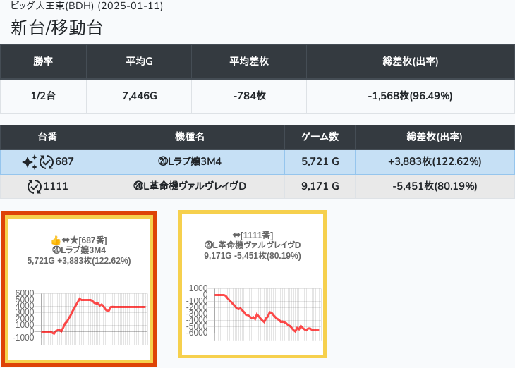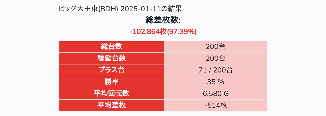 【オンサロ要望】 1月11日 ビッグ大王東(BDH) -102,864枚 スマスロ北斗 4/7台 番長4 3/3台 ファンキージャグラー 3/5台