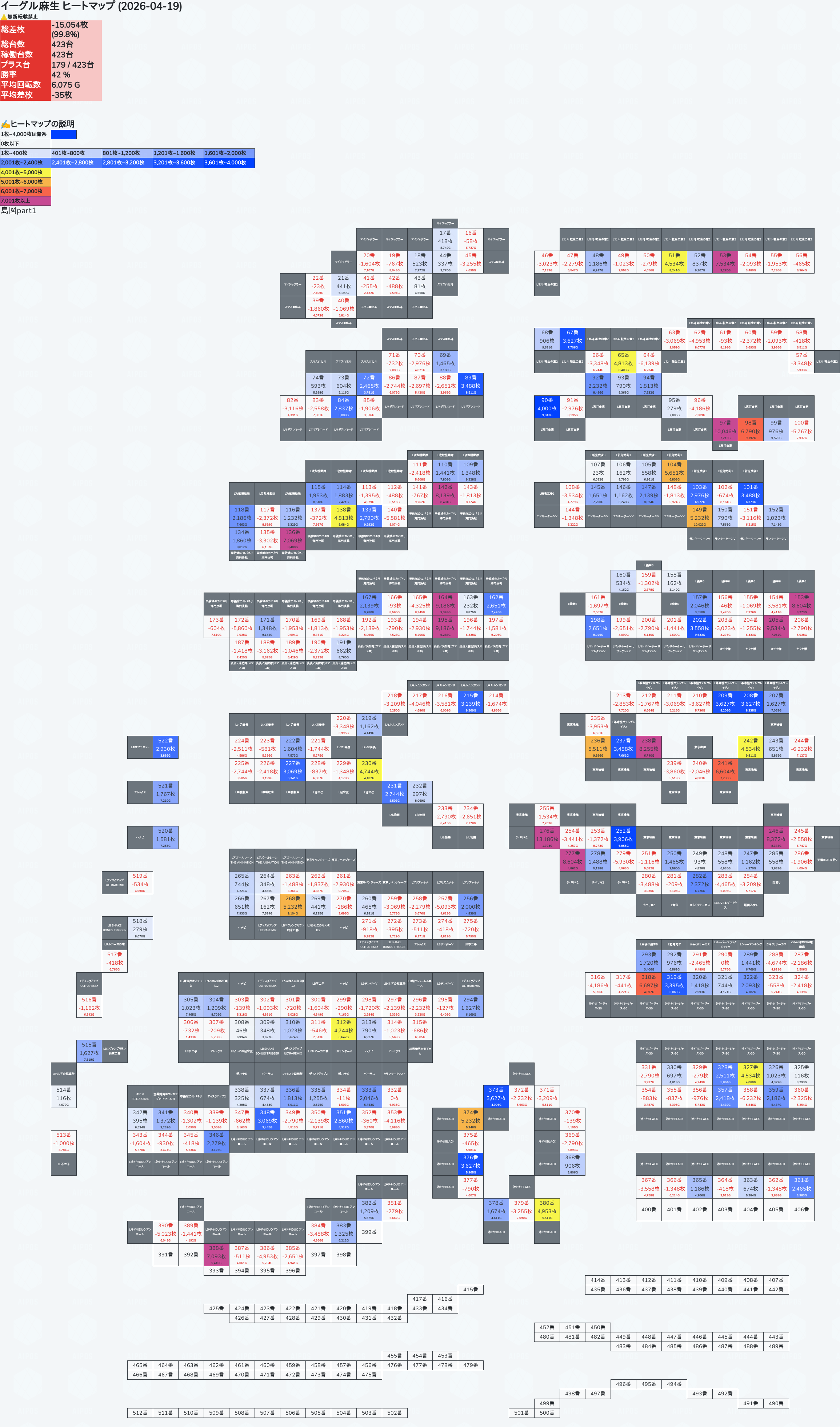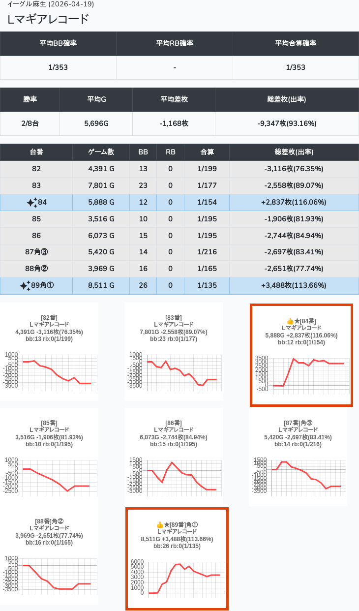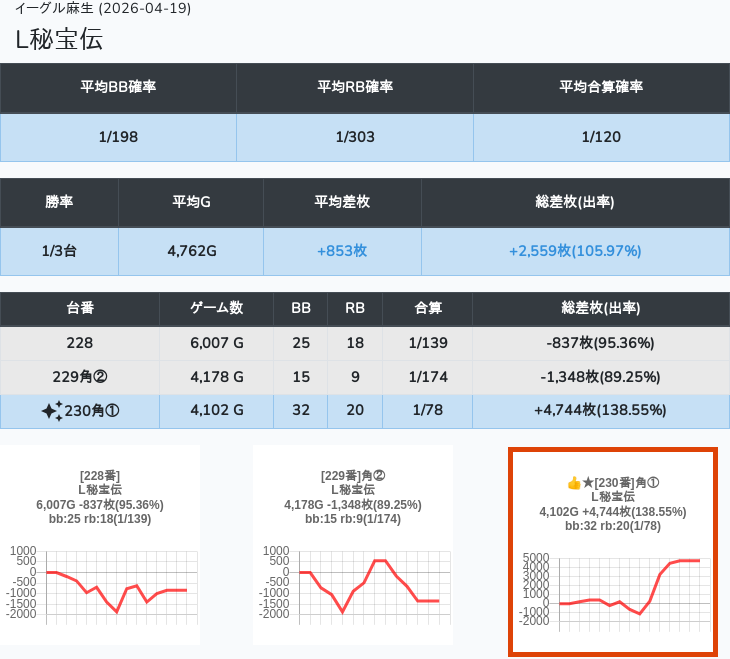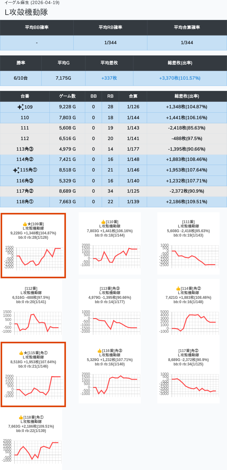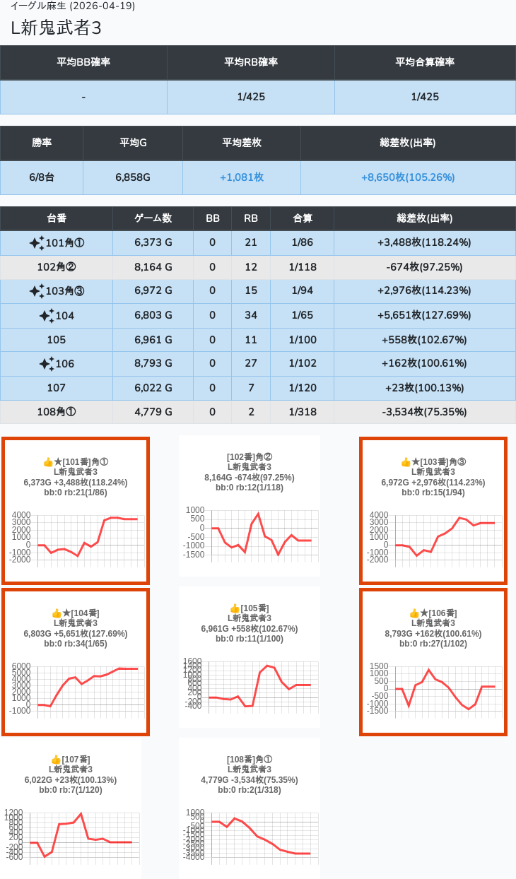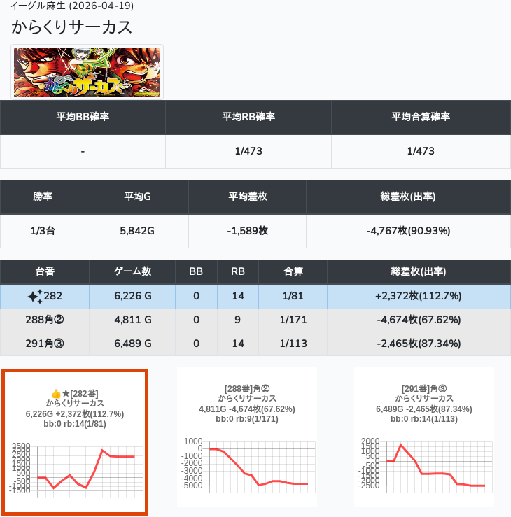 【オンサロ要望】 4月19日 イーグル麻生 -15,054枚 L真打吉宗 8/11台 L新鬼武者3 6/8台 L攻殻機動隊 6/10台