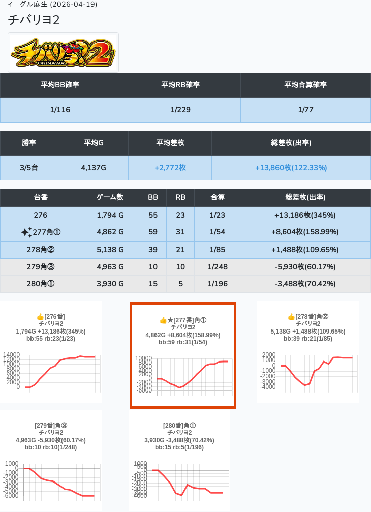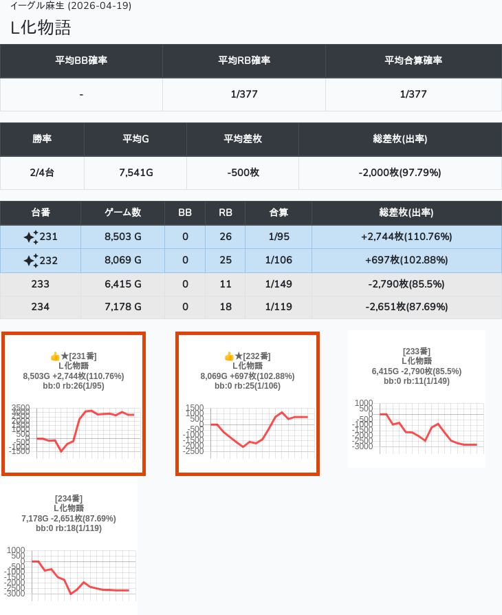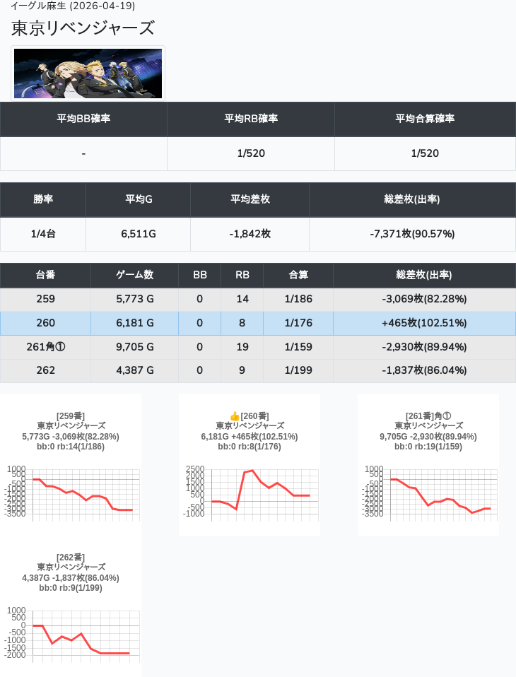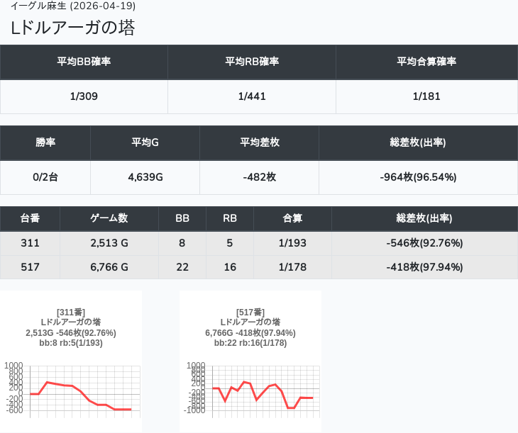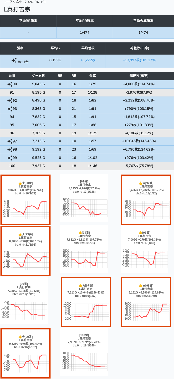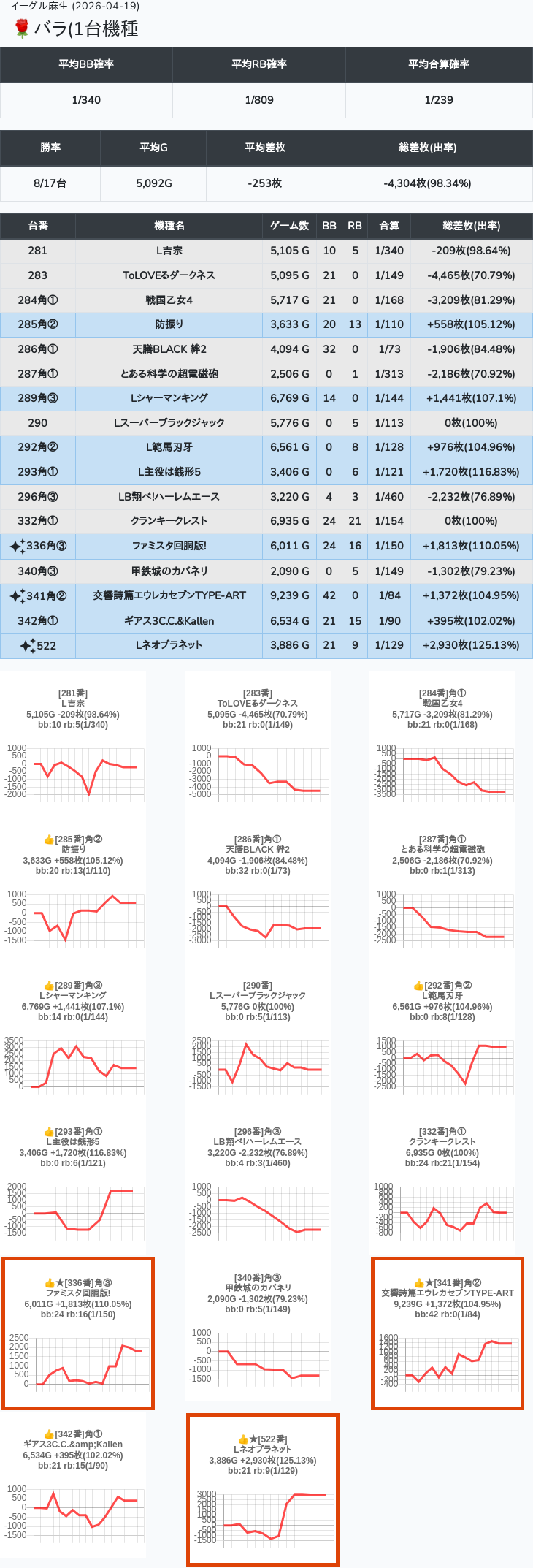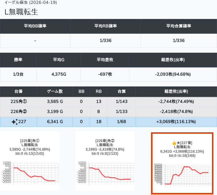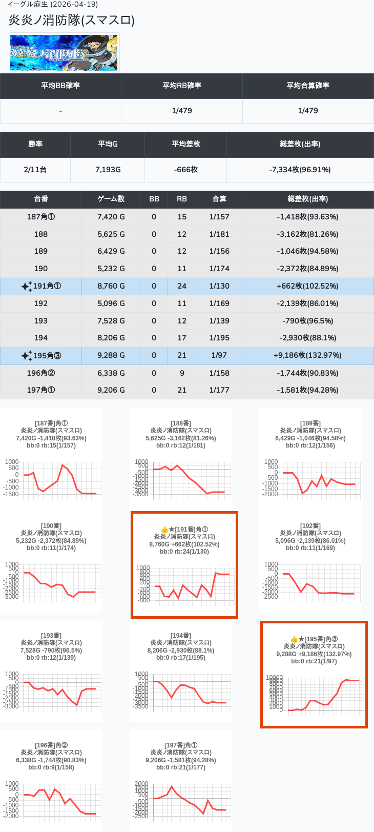 【オンサロ要望】 4月19日 イーグル麻生 -15,054枚 L真打吉宗 8/11台 L新鬼武者3 6/8台 L攻殻機動隊 6/10台